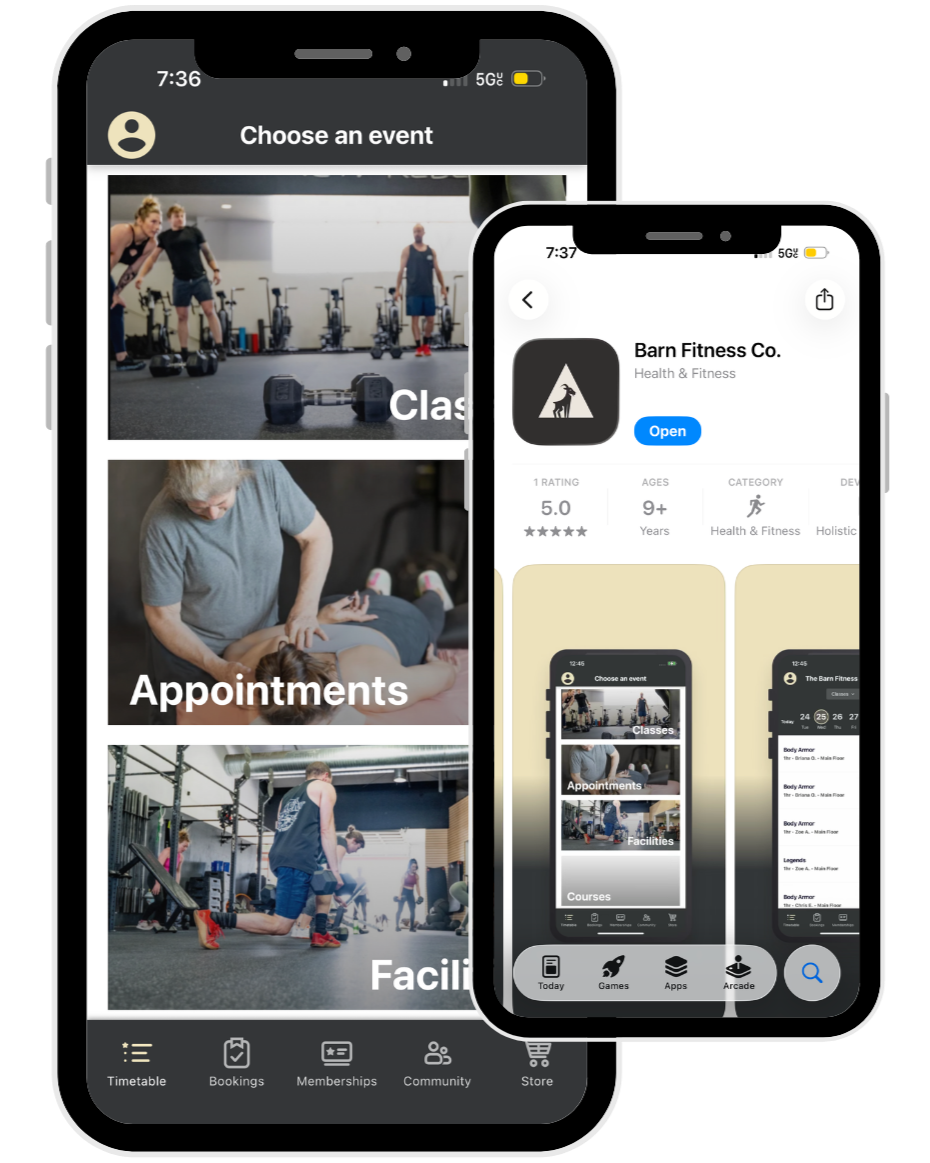 Download the “Barn Fitness Co” app from the Apple App or Google Play Store.